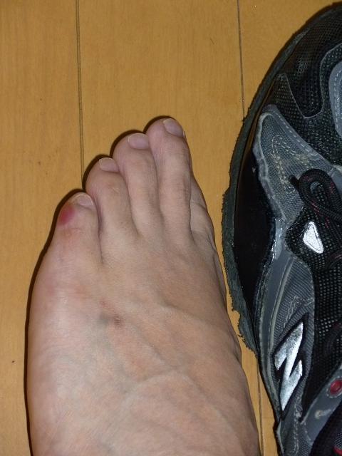 靴の中で足が外側にズレ落ちようとし、小指が修復箇所に押し付けられ、擦過傷から水ぶくれが発症してしまいました。(左写)