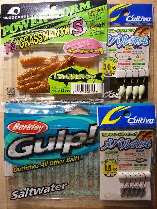 種類が豊富で、素人にはどれを選んだらよいのか分からず、とりあえず店員さんのオススメのワームを2種とオモリを2種(1,5gは上層を探る用、3gは底物用)購入してみました。