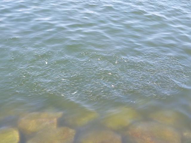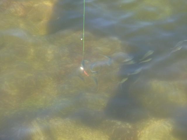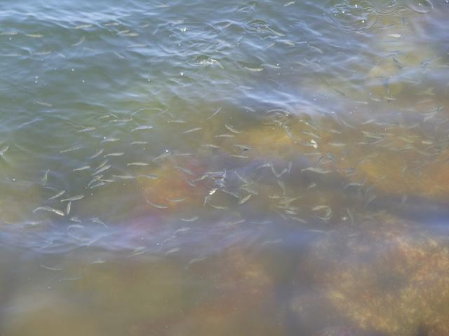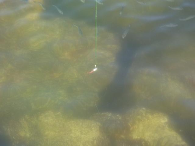 小魚(ボラかな~?・・・謎)の大群がお食事中だったので、その中にワームを投入し興味を示すのか実験してみました。