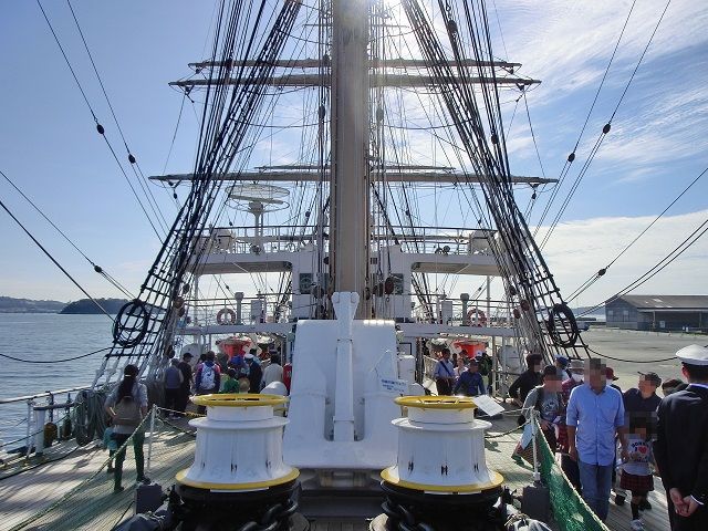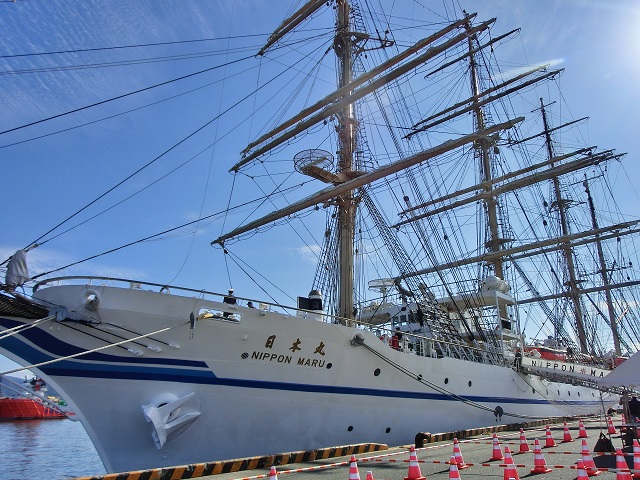 快晴の秋空の下に停泊する帆船は、迫力と美しさを兼ね備える魅力的な容姿をしていました。