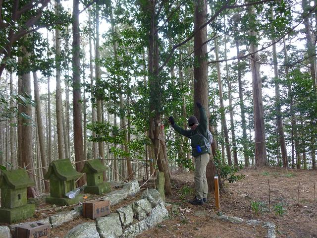 山頂には三基の祠があり、木には様々な山頂標識が括り付けられており、思っていた以上に人々との関わりが濃い山だという感じがしました。