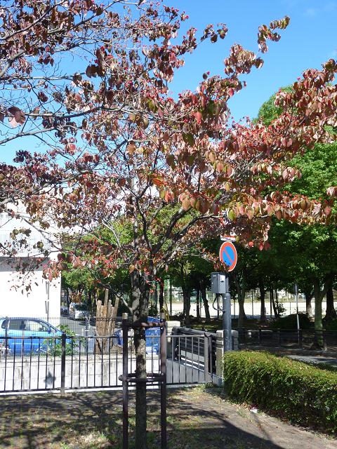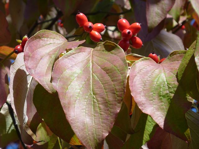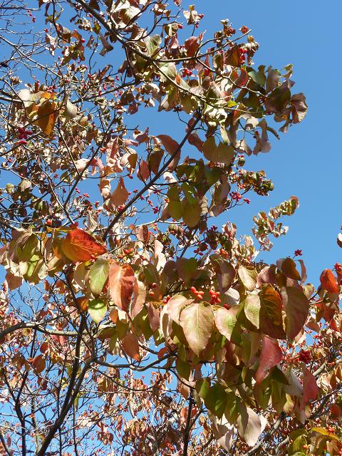 ハナミズキの赤い実が青空に映え、葉も紅葉しだしました。