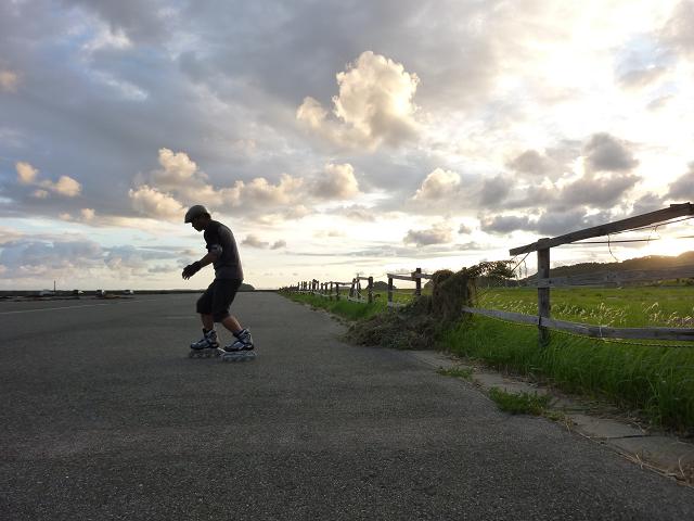帰宅の際、パラパラと少し雨が降ってきたので、桑谷山へは上がらずインラインスケートをしに海へ出かけました。