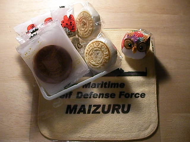 黒豆餅・丹後ちりめんのフクロウ・海上自衛隊のタオル。