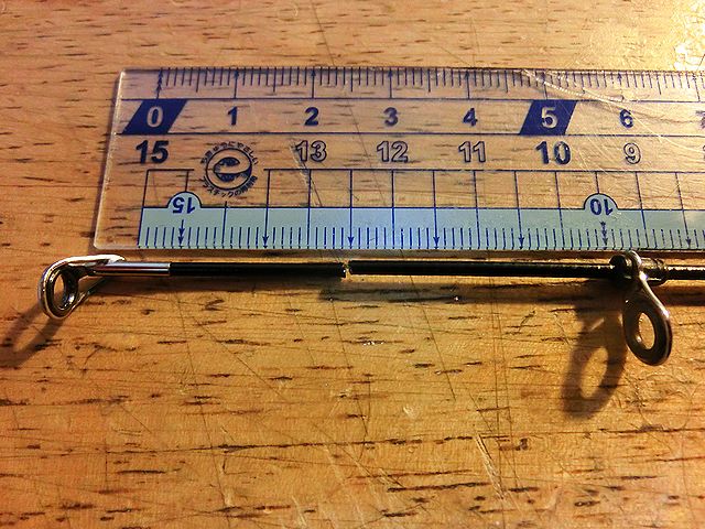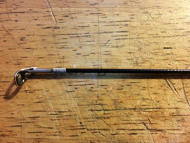 釣り具屋にて相談したところ、破折部を接着しようとするよりも、数cm短くなるが破折端に先端ガイドを付け替えた方がよいとのことでしたので、その様に修理してみました。