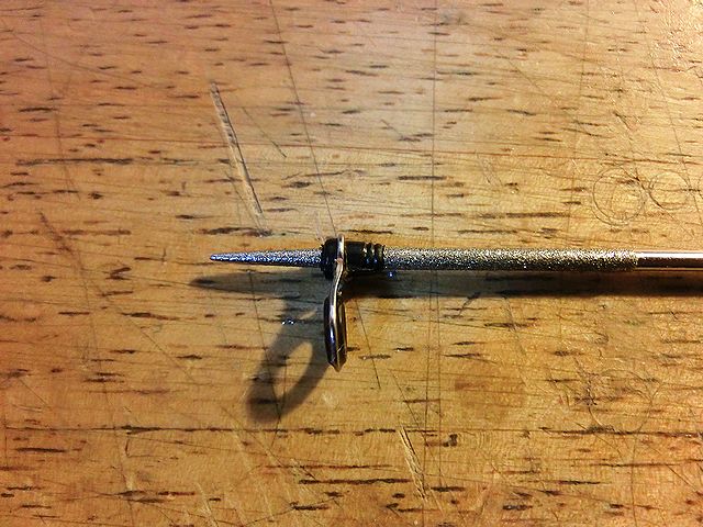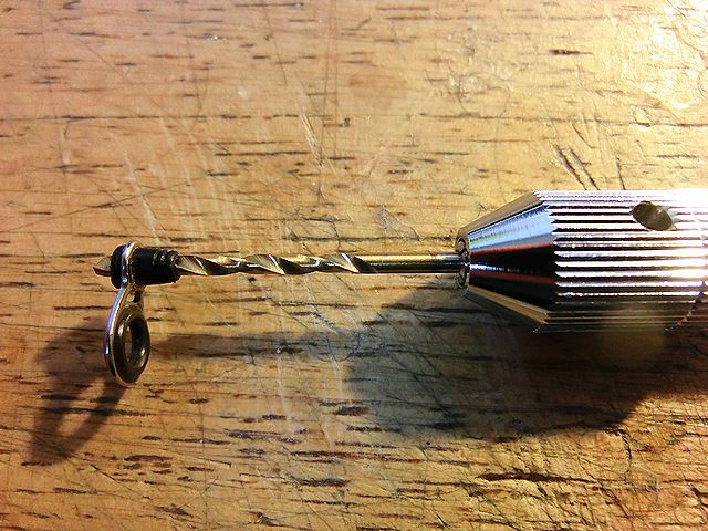 写真4:2番ガイドの竿通し部を、ピンバイスで拡張しました。