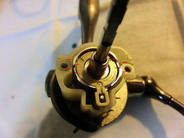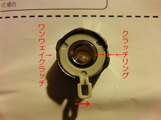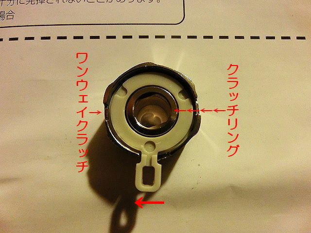 写真5:組み立て時に、ワンウェイクラッチのレバーが右側にあると、切り欠きが合わず、ワ