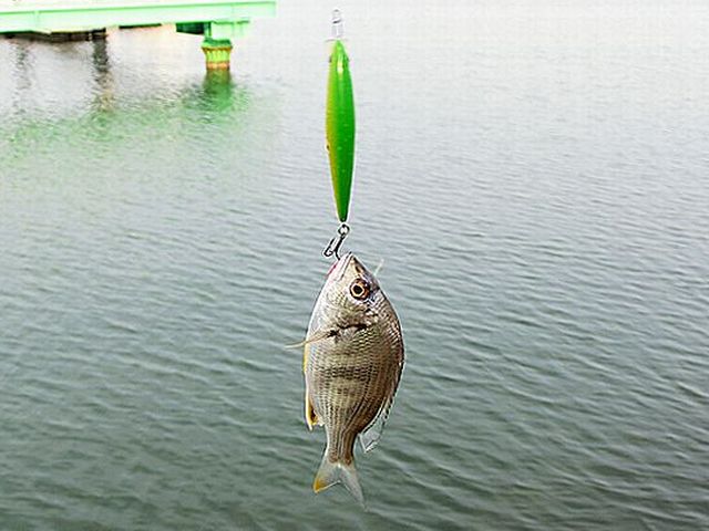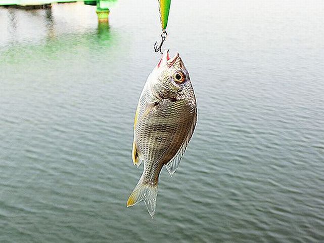 手の平サイズでしたが、初めて鯛(キビレ)が釣れました。