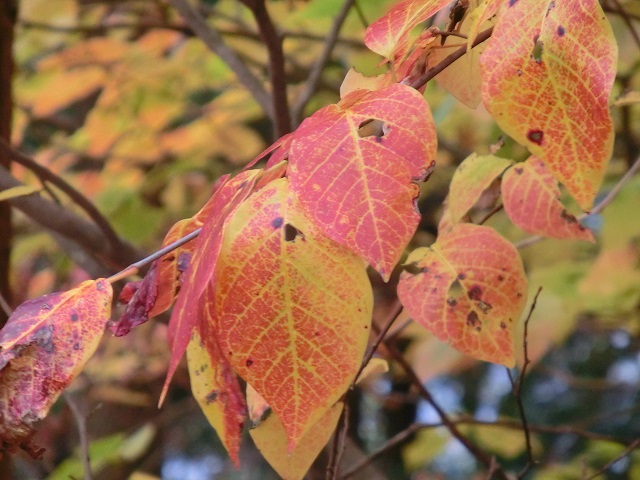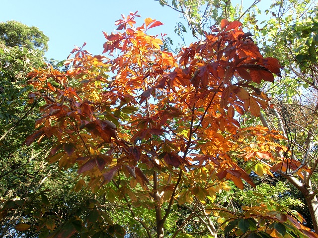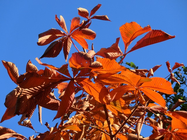 トチノキの大きな葉が、朝日に照らされて色鮮やかに発色していました。
