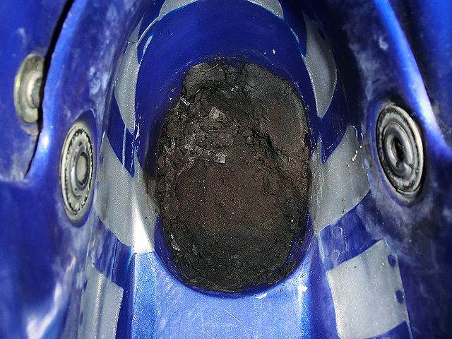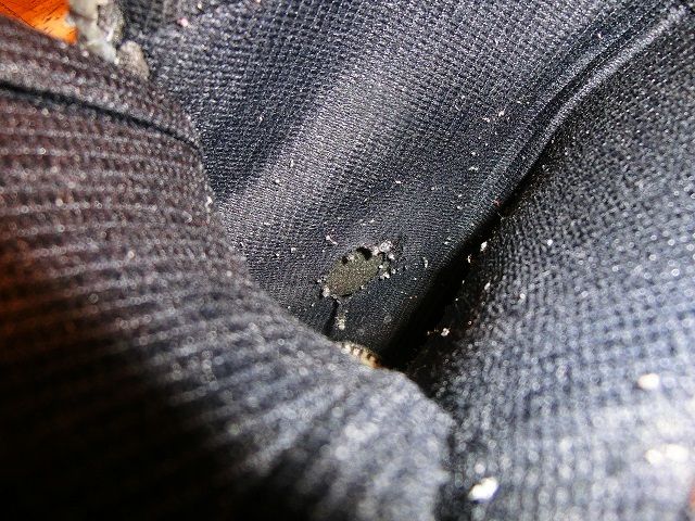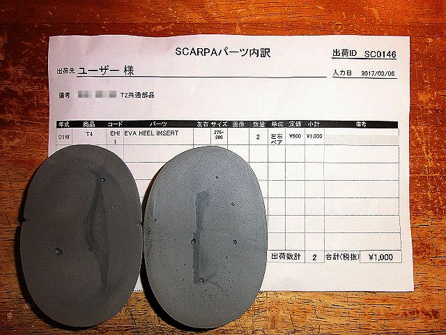 Scarpa T2 シェル底踵部のパッドが粉砕 指で触ると粉状…
