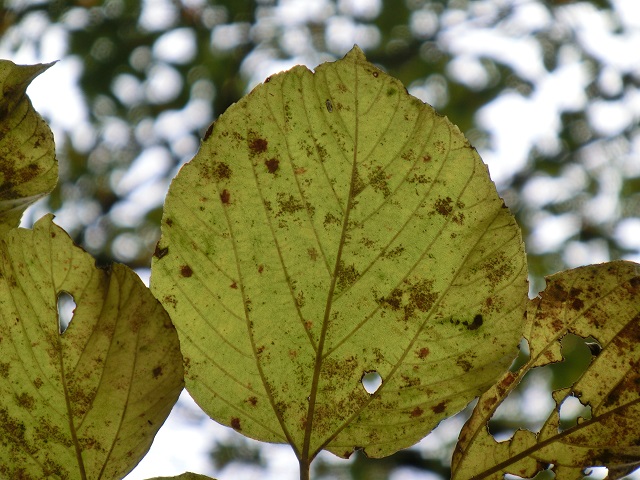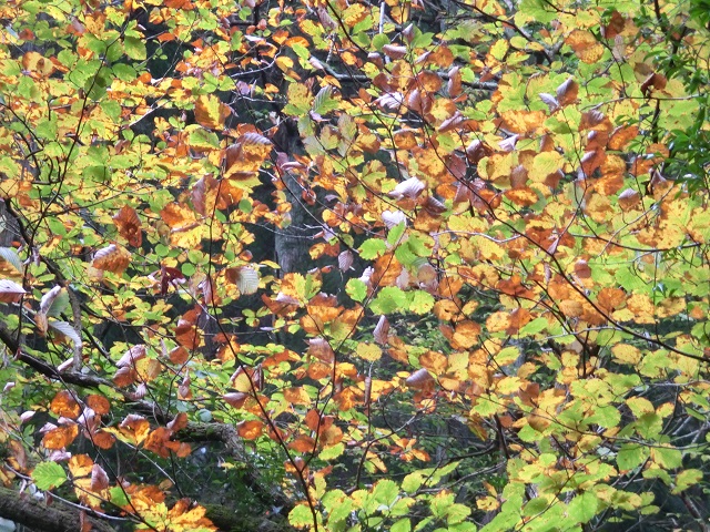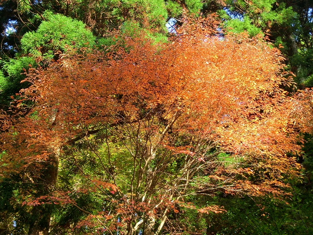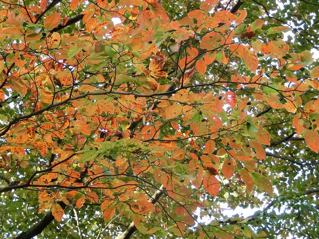 橙色の中に緑色(葉脈部分)が残る葉に光が透けて、とても奇麗でした。