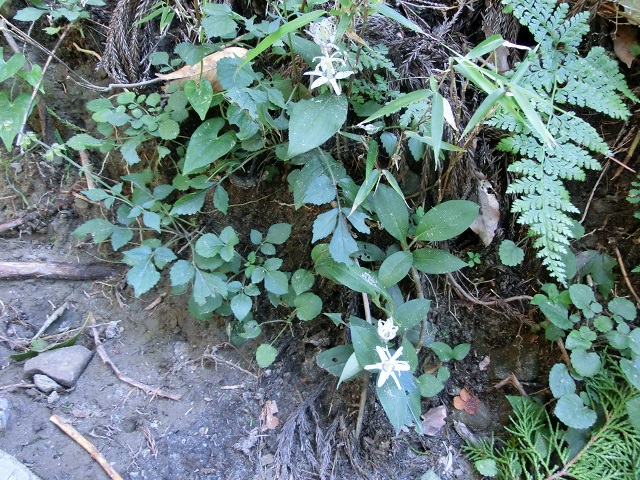 前回の散歩では、ミヤマウズラの花を見ることが出来たので、今回も何か咲いていないかキョロキョロしながら歩いていたところ、四十七丁目辺りで白い花が目に留まりました。