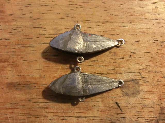 そこで、手持ちの既製品のボディー形状に近づく様に鉛シートを切り貼りしボディーを成型し、同様の位置にねじ込み型のアイを取り付けてみたところ、何とか真っ直ぐに近い姿勢で泳いでくれる様になりましたが、何度かルアーを投げているうちに、再び泳ぐ姿勢が悪くなってしまいました。