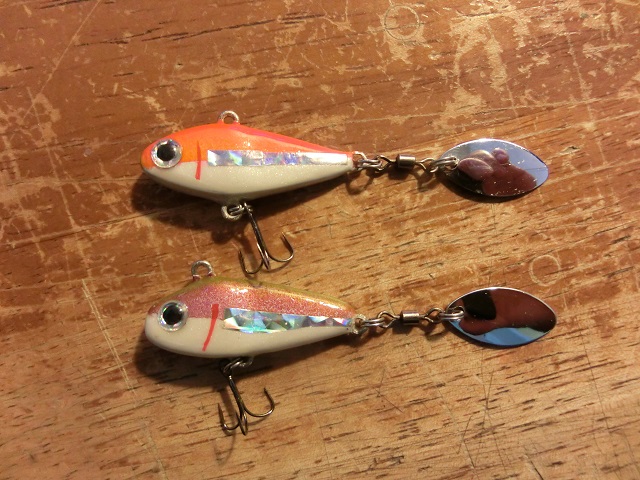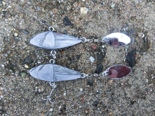 今回は丸葉型と柳葉型を試してみたのですが、前者はブルンブルンと振り回すとった印象で、ラインを巻いた際の抵抗が強い印象で、後者は前者より回り方が滑らかで、ラインを巻いた際の抵抗も小さい印象でした。