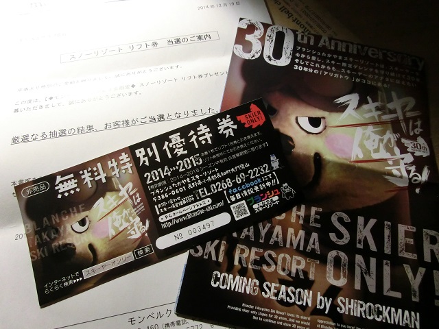 モンベル スノーリゾート リフト券プレゼントに当選し、ブランシュたかやまのリフト券をいただきました。!(^^)!