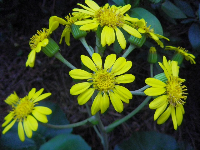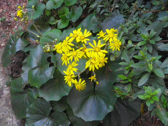 西浦園地へ上がる石段沿いに、ツワブキが開花していました。