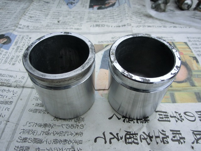 キャリパーシリンダー(左写)とキャリパーピストン(中写:研磨前、右写:研磨後)です。