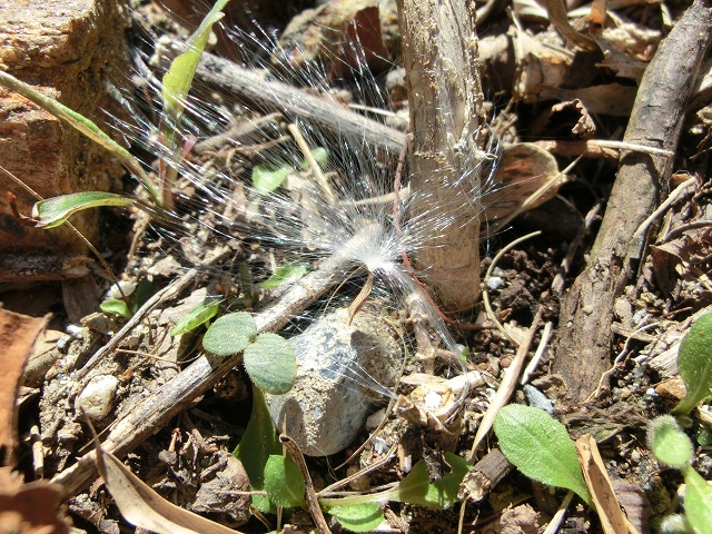 林道散策をしていると、微風に乗ってフワッと宙に舞い上がったり、地面をユッタリ転がったりしている、毛足5cm程の白い毛を放射状に生やす物体が目に留まりました。