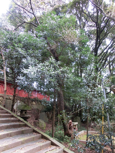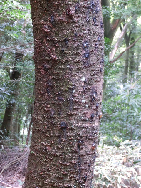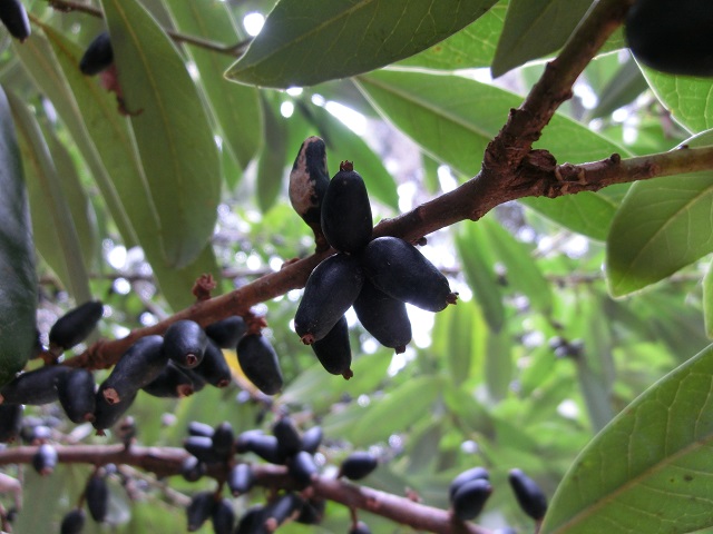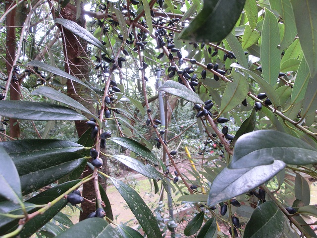 先日、山中八幡宮を参拝した際に、長さ約1.5cmの洋ナシ型の黒い実が沢山足元に落ちており、この樹から落ちたものだと知りました。