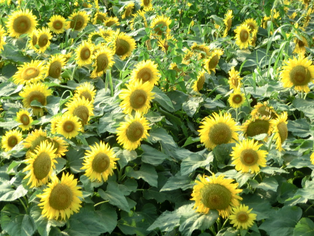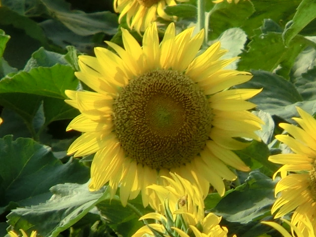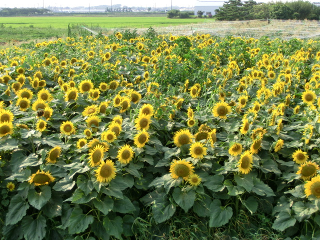 照りつける陽光の下、ヒマワリが大輪の花を咲かせていました。
