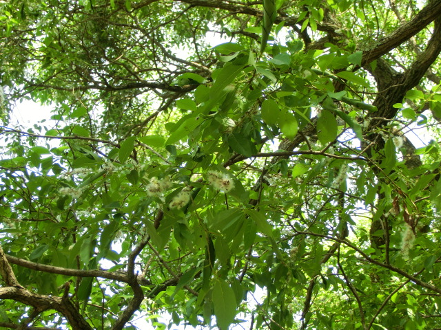どこから落ちてくるのだろう?と周囲を見回すと、大きなマルバヤナギの樹からでした。