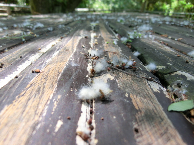 柳絮が、風に吹かれて飛び漂っており、周囲に沢山降り落ちていました。