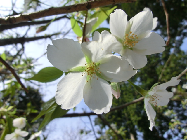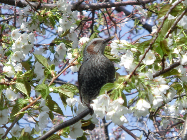桜の蜜を吸うので、嘴の先に黄色い花粉を付けていました。