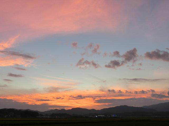 様々な形の雲がピンク色に染まり、綺麗な夕暮れでした。