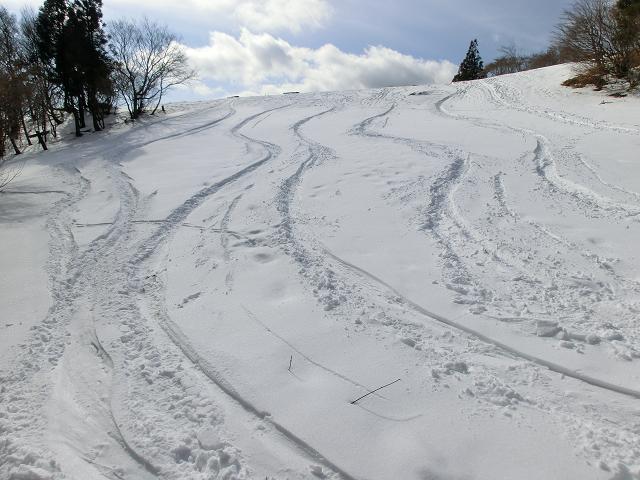 斜面には、一昨日降った雪が10~20cm程乗っており、モッサリ重くなっていましたが、流石に板が太いとパワーが違う様で、何故か私にも快適に滑り下りることが出来ました。(^^)!