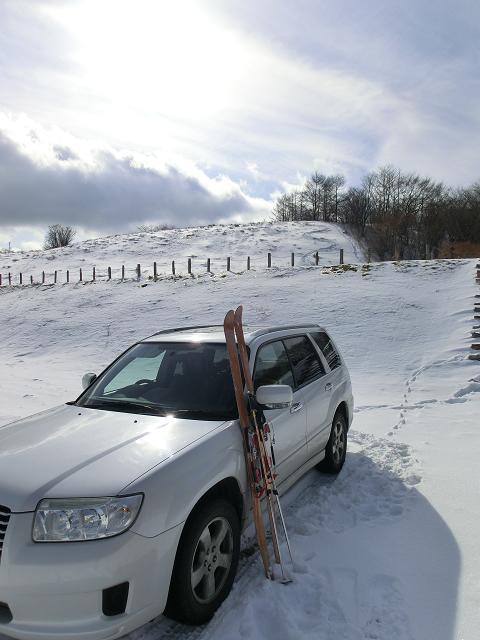 車の後方に、最初に滑ったシュプールが見えますが、結局ここが今日1番気持ちよく滑れた場所でした。(^_^;)