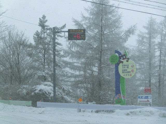 平野部は青空でしたが、本宮山麓~上津具~茶臼山高原道路では曇天となり、スキー場へ近づくと降雪しており、気温計はお昼だというのに-6℃を表示していました。