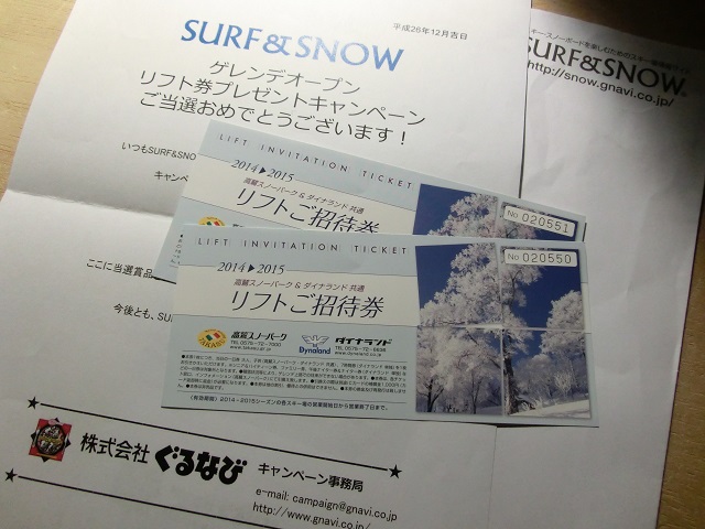 SURF&SNOW ゲレンデオープン リフト券プレゼントキャンペーンに当選し、ダイナランドのリフト券をいただきました。!(^^)!