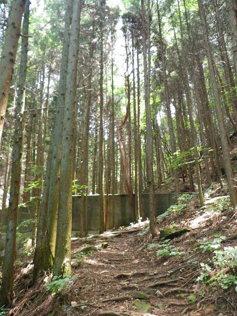 植林帯の中を上がって行き、堰堤を乗り越えます。