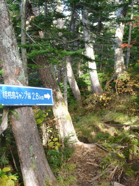 登山道半ばに案内板(左写)があり、キャンプ場への分岐(右写)があります。