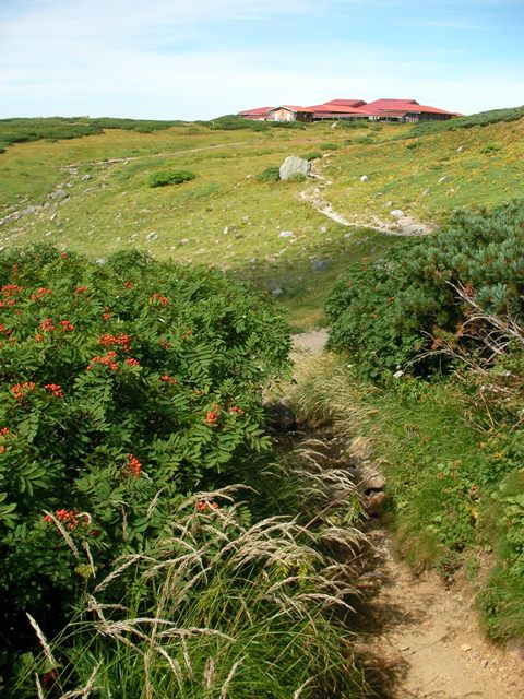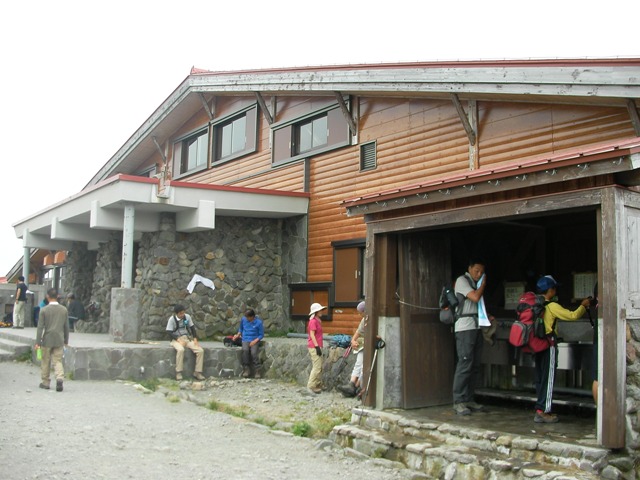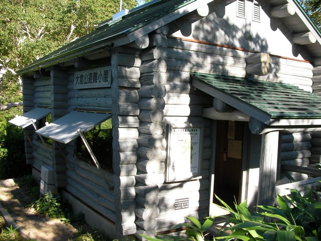 右前方に御前峰と剣ヶ峰が見えてくれば(左写)、すぐに大倉山避難小屋(右写)です。