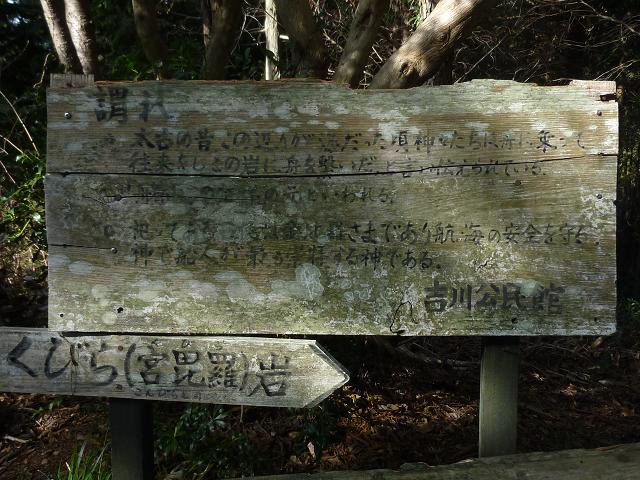 ※名前の由来ですが、ガイドブックには吉田(現:豊橋)からの交易は、豊川で舟運によって舟着山山麓の日吉の舟場に運ばれ、馬の背に荷を積み替えて伊那街道を往来したこととありますが、山頂の看板には太古の昔に山頂付近がまだ海だった頃、神々が舟で往来しており、くびら岩(山頂直下の岩)に舟を繋いだことがその由来となっていました。