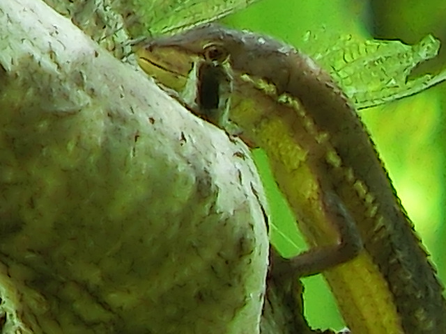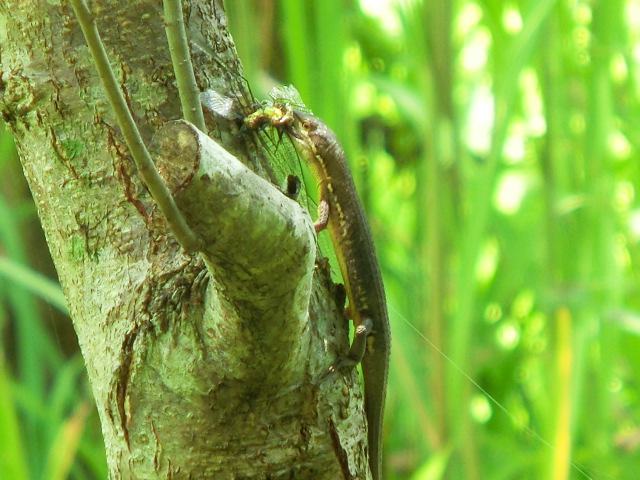 そこで、オオシオカラトンボのメスを見ようと息を潜めて草叢を観察していると、ニホンカナヘビがトンボを銜えて木の幹をスルスルと上がる光景が目に留まりました。
