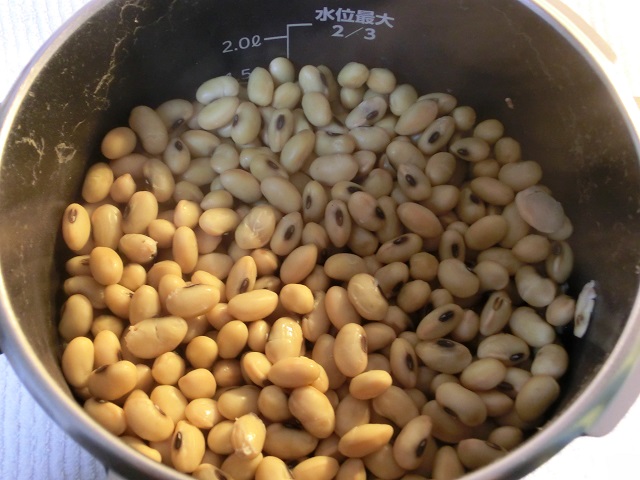 大豆を水に浸して9時間後の状態です…膨潤量を甘く見ていました。(^_^;)(左写)