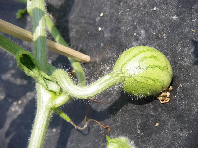 昼過ぎに仕事が終わり、昨日スイカ畑で人工授粉した雌花が気になって畑に寄って確認して来ました。