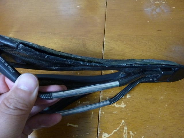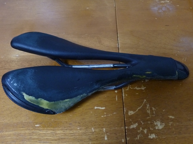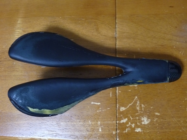 古いサドルの皮の剥け方をみると、骨盤が真っ直ぐに乗っていなかった事が良く分かります。