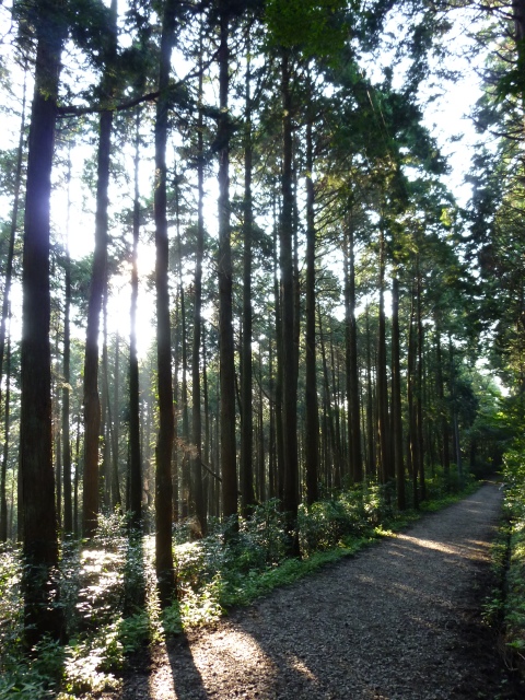 朝日に向かって伸びる林道は気持ちよいです。(中写)