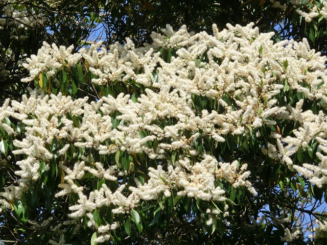 華やかな白い花序とその下にタラ~ンと吊り下がった様に見える濃緑色の葉のコントラストが印象的でした。