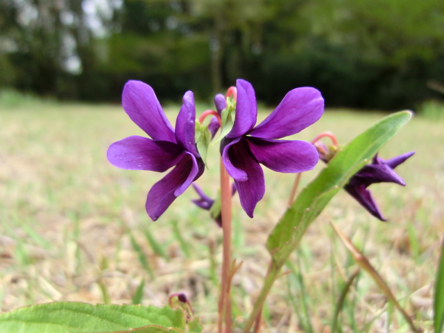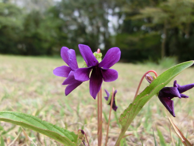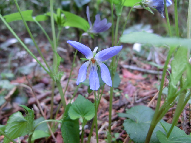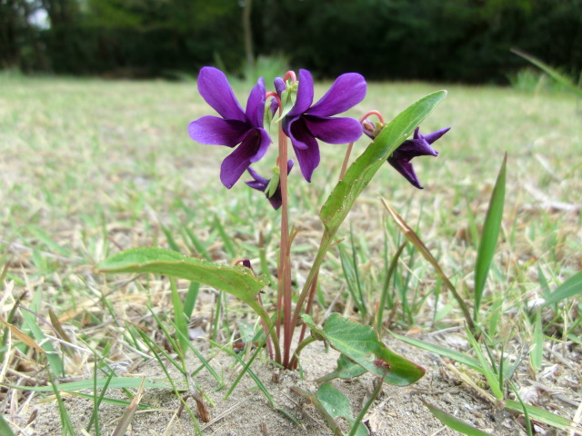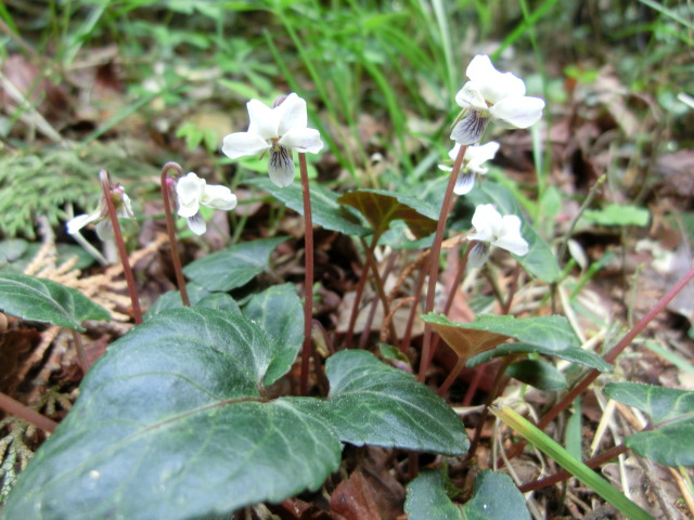 距はピンク色で、花柄は赤味をおび、葉の基部は大きく右湾入していませんので、ニョイスミレ(ツボスミレ)ではないと思うのですが・・・謎?