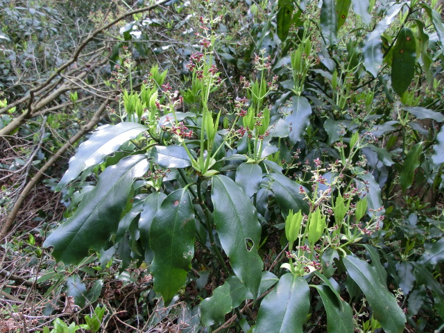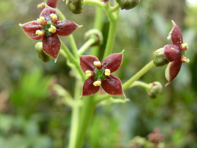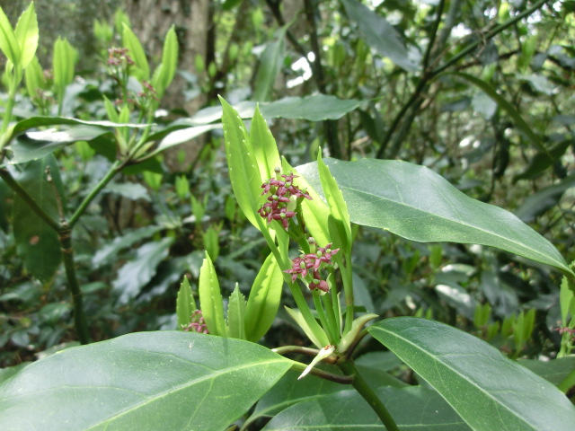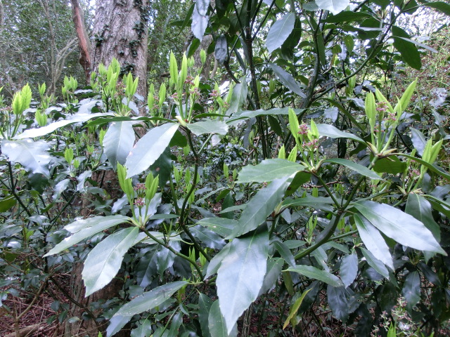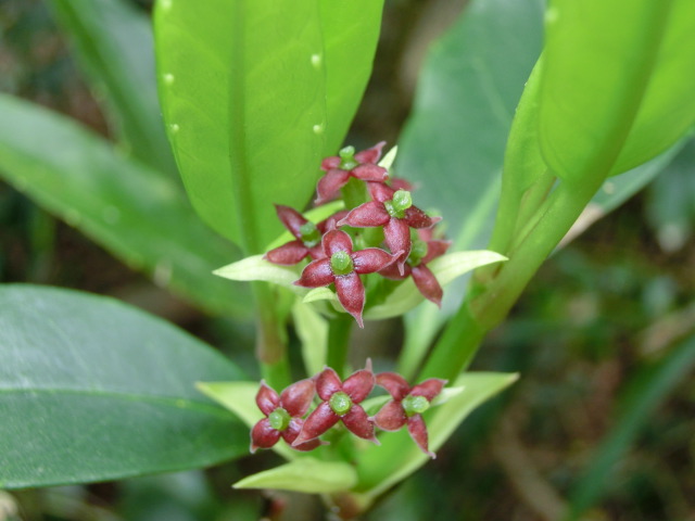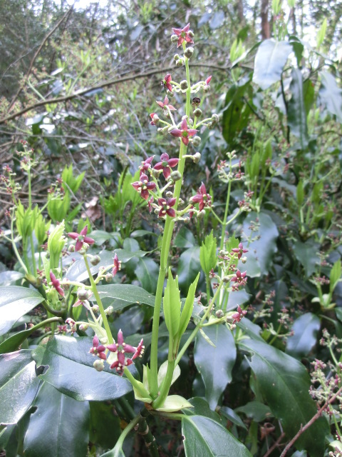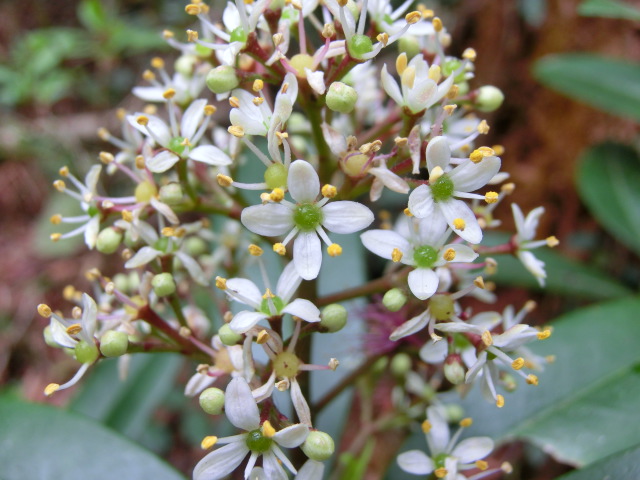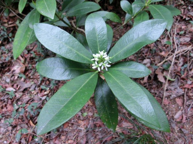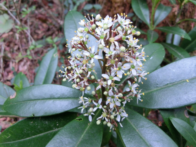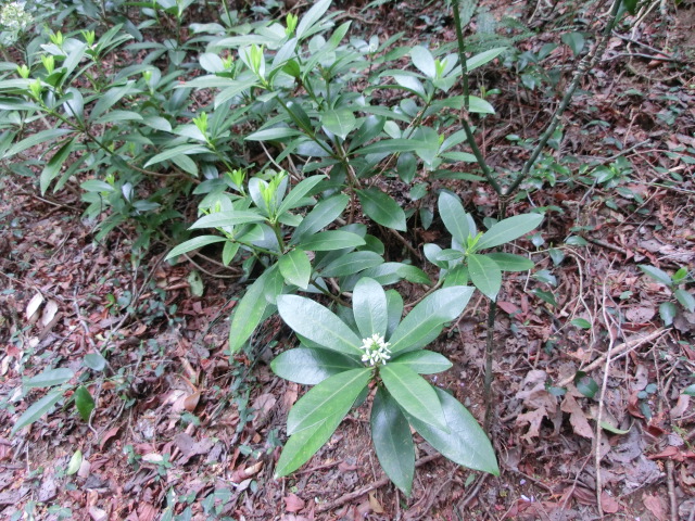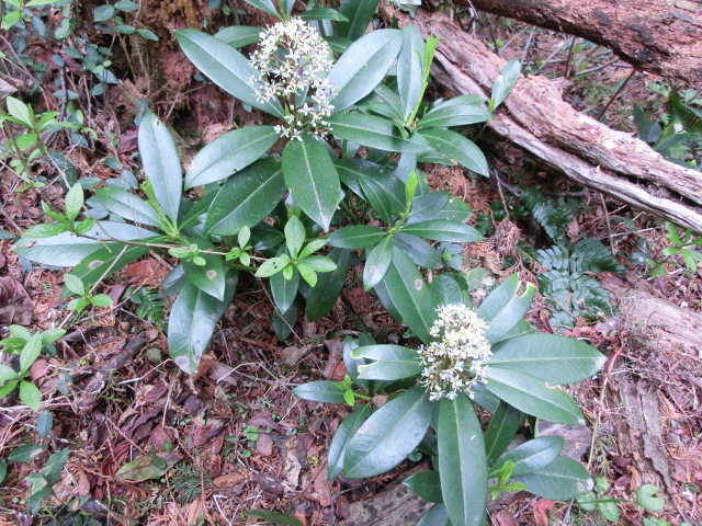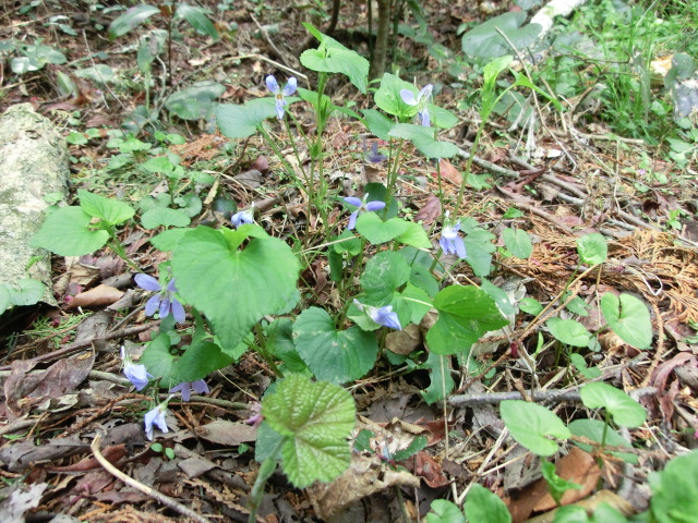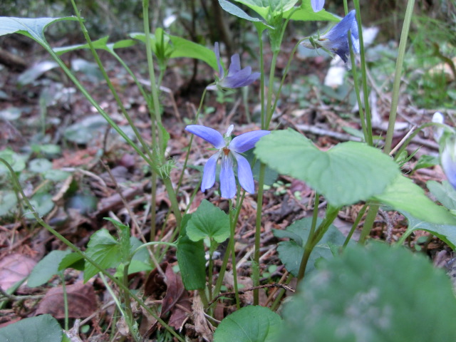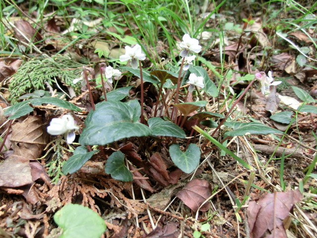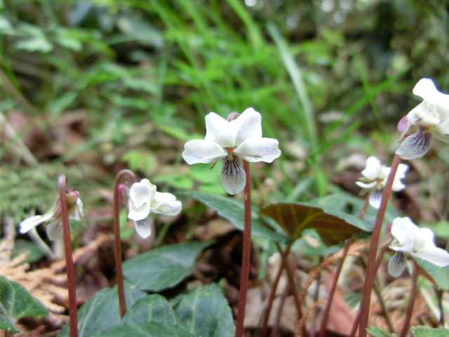 スミレ、背丈が高く葉が大きいスミレ、白いスミレ(フモトスミレ?)、アオキの雄花・雌花、ミヤマ