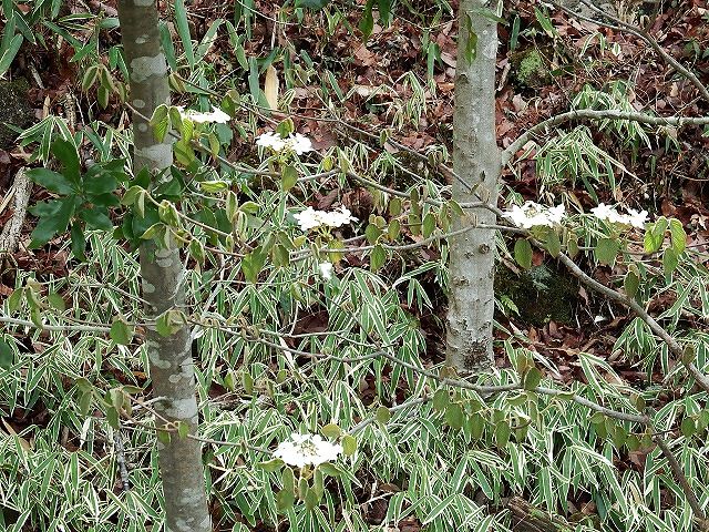先日、創造の森城山公園(川尻城址)を散策した際に、白い装飾花を付けた枝を水平に伸ばす低木が目に留まりました。