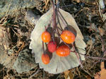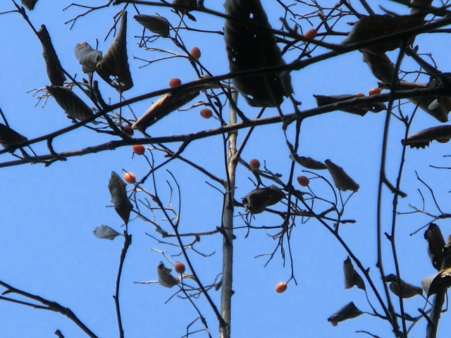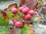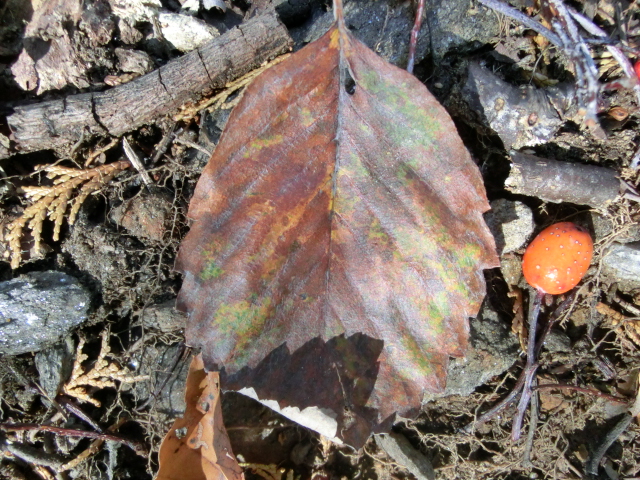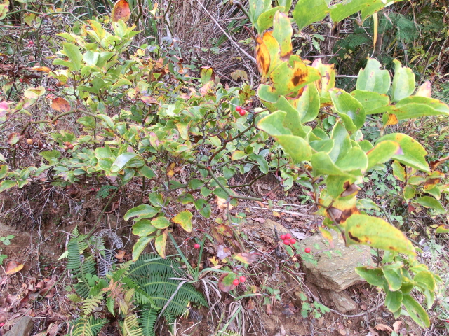 ※コアジサイの黄葉、ウラジロノキの黄・橙・赤色の実、ムベの紫色の実、サルトリイバラの