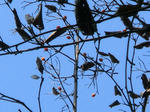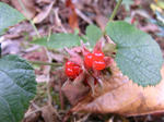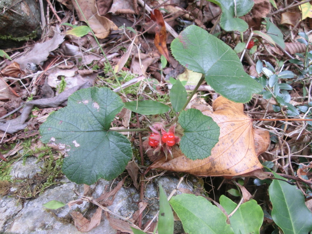 赤い実、フユイチゴの赤い実、ミヤマキシミの赤い実、アオキの青い実、ノハラアザミの花