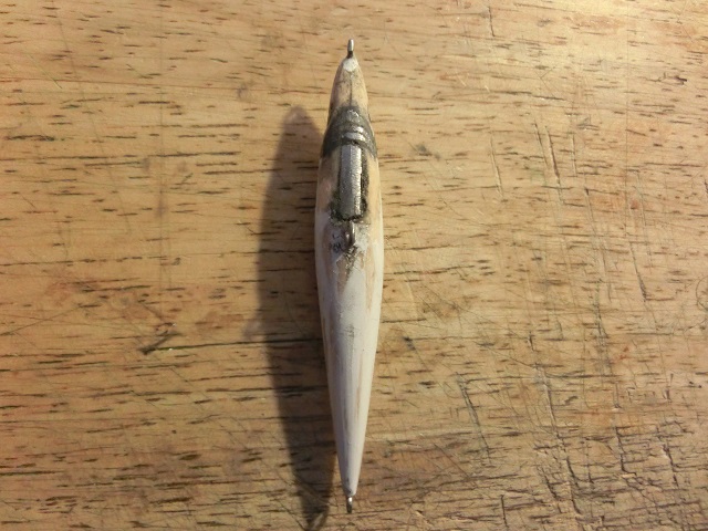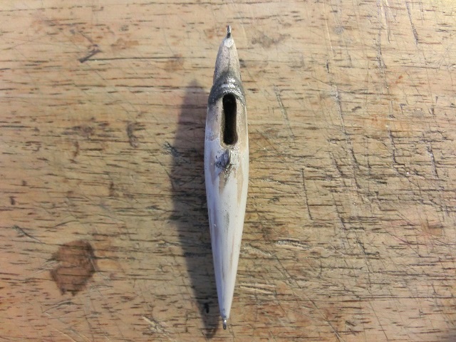 まずは背腹の姿勢を保持させるために低重心にしようと思い、リップを除去した凹部に鉛を詰め、その後部に錘を詰めるための穴を開け(左写)、そこに鉛を詰めました。(中写)