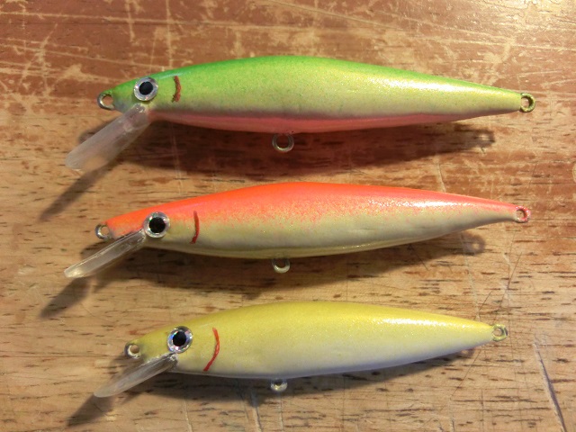 プラサフの表面をヤスリ掛けし、全体にサテンホワイトP(車用のタッチアップ(^^ゞ)を塗布し乾燥させ、上半分にゴールド(フェザー社、ルアーメイクカラー)をラッカーで薄めて塗布し乾燥させ、その上にN.T.蛍光塗料 緑(TOHO社)をラッカーで薄めて塗布し乾燥させ、その後、目玉の付与とエラ部にレッド(フェザー社、ルアーメイクカラー)をラッカーで薄めて線を書きました。
