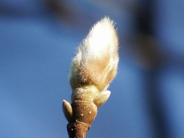 銀白色の毛に覆われた芽麟が印象的な、ハクモクレンの蕾です。